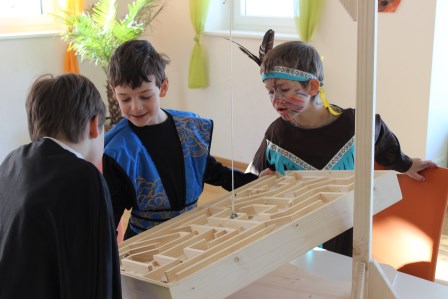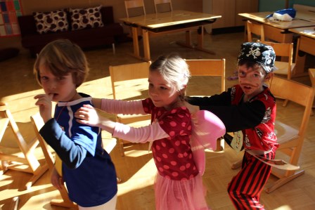 Gleich zu Schulbeginn starten wir mit einer langen Polonaise durch das gesamte, matschige Schulhaus. Dann wird erst einmal in den furchteinflößenden Klassenräumen gefeiert, bevor die verrückten Türen geöffnet werden und die coolen Kinder sich an kniffligen Stationen austoben können. Die coolen Kinder können knackige Spiele machen, etwas langweiliges basteln, runde Figuren zeichnen, im riesigen Turnsaal Zumba tanzen und sich durch ein perfektes Labyrinth kämpfen. Wenn die coolen Kinder Hunger haben, können sie in den blassen Werkraum gehen und ein nervöses Leberkässemmerl essen.